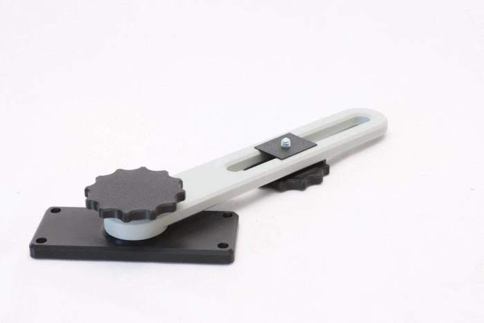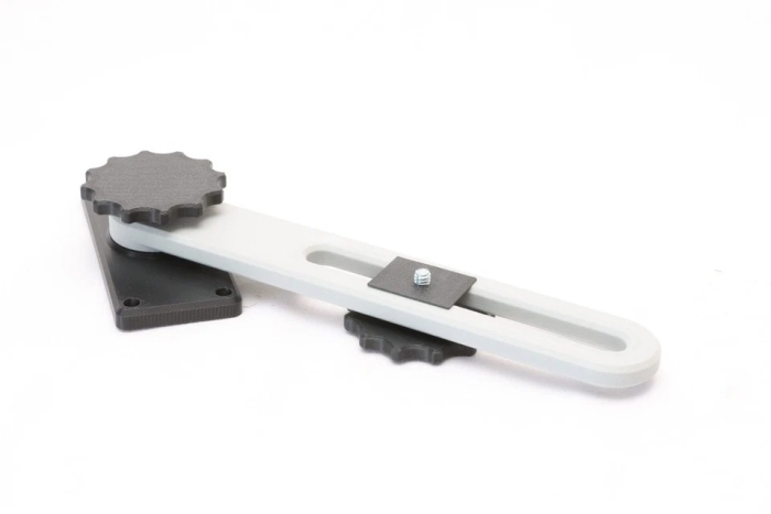The arm is made of fiberglass infused ABS to be strong and stiff. The main knob has a captured metal nut for threading onto the mounting plate bolt.